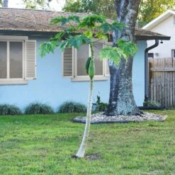 This is a fast-growing tree with a long single trunk leading up to lush green lobes. You will get a gorgeous color show with your tree. You can expect the tree to be adorned with either bright green or yellow ripened papaya fruit.